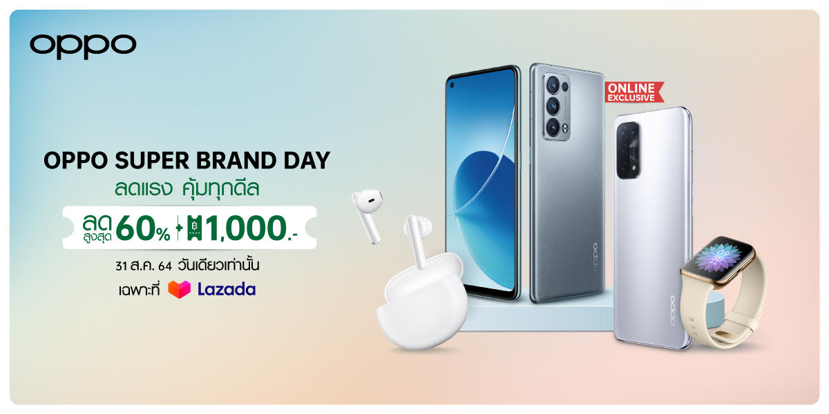 OPPO จัดโปรแรงส่งท้ายเดือนสิงหาคม เอาใจนักช้อปด้วยโปรสุดคุ้มมากมายผ่านแคมเปญ OPPO Super Brand Day ด้วยส่วนลดทั้งสมาร์ทโฟนและอุปกรณ์เสริมสูงสุดถึง 60% พร้อมคูปองส่วนลดสุดคุ้มสูงสุด 1,000 บาท และของสมนาคุณอีกมากมาย รวมมูลค่ากว่า 212,988 บาท เฉพาะวันที่ 31 สิงหาคมนี้ ที่ OPPO Official Store บน Lazada เท่านั้น