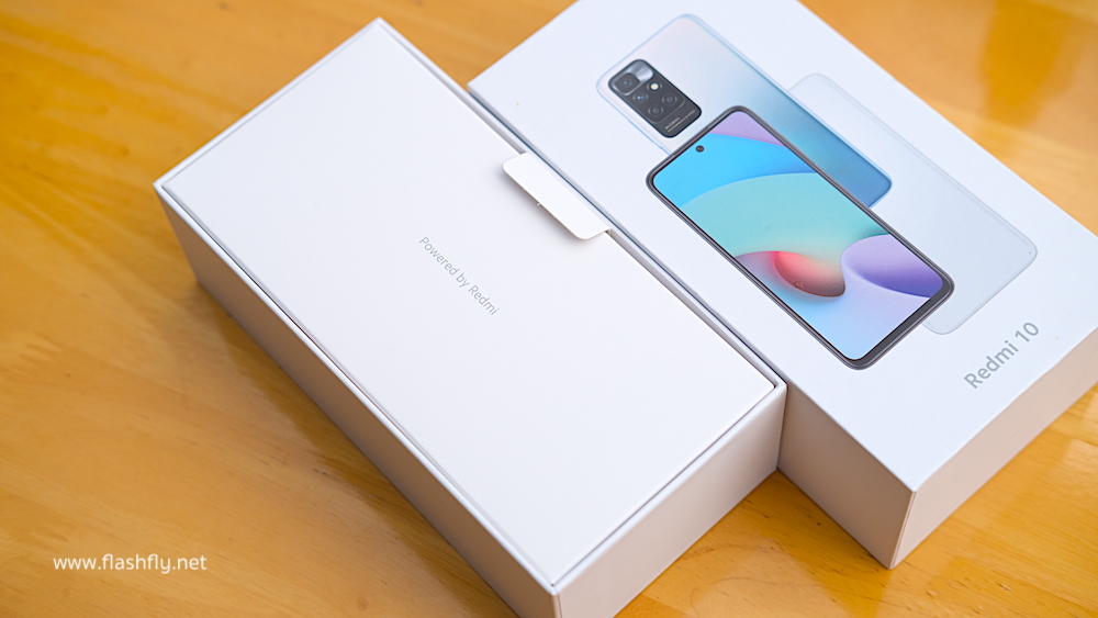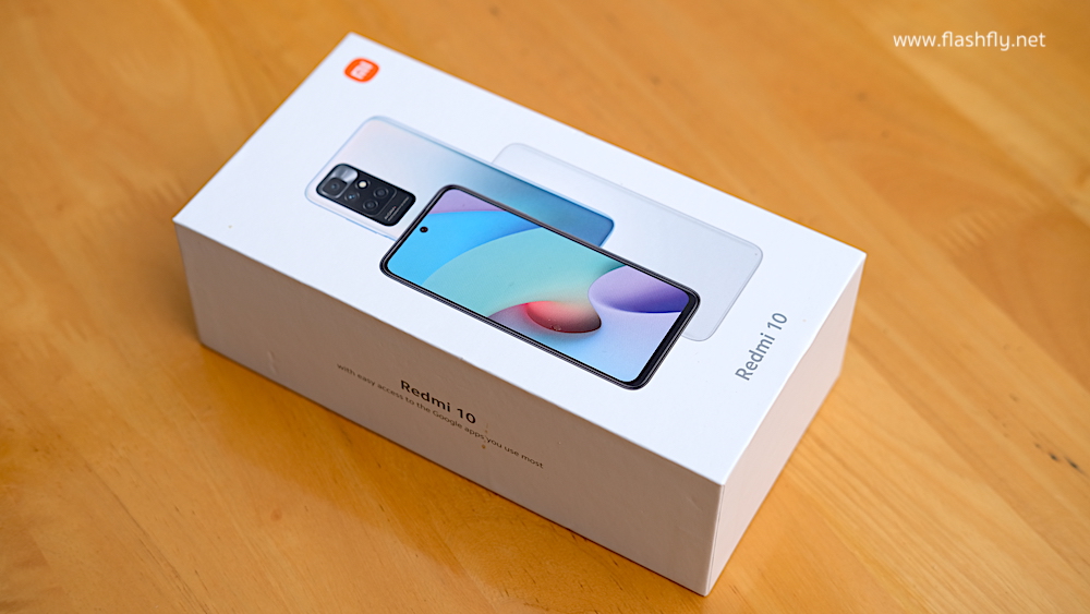 Redmi 10 ถูกบรรจุไว้ในกล่องสีขาว หน้ากล่องพิมพ์รูปภาพสมาร์ทโฟนเผยให้เห็นดีไซน์ด้านหน้าและบางส่วนของด้านหลังอย่างชัดเจน พร้อมติดโลโก้ Mi ไว้ที่มุมบน และระบุชื่อรุ่น Redmi 10 ไว้ใต้รูปภาพผลิตภัณฑ์