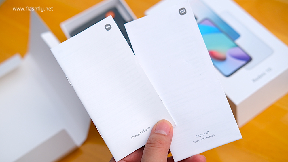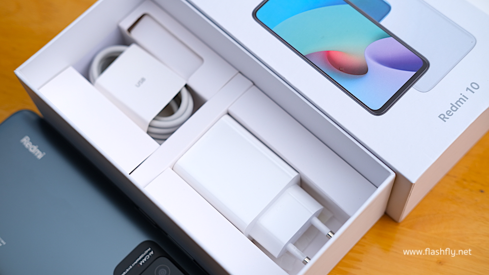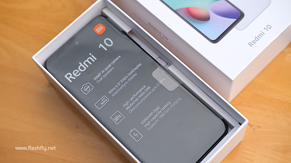 สมาร์ทโฟน Redmi 10 ได้รับการห่อหุ้มมาเป็นอย่างดี พร้อมระบุจุดเด่นไว้ 4 รายการ ได้แก่ ระบบกล้องหลัง 50MP AI Quad Camera พร้อมลำโพงคู่, จอแสดงผล Full HD+ DotDisplay ขนาด 6.5 นิ้ว ให้อัตราการรีเฟรชหน้าจอสูงสุด 90Hz, ชิปประมวลผล MediaTek Helio G88 ความเร็วสูงสุด 2GHz Octa-core และมีความจุแบตเตอรี่ขนาดใหญ่ 5,000mAh พร้อมรองรับชาร์จเร็ว 18W