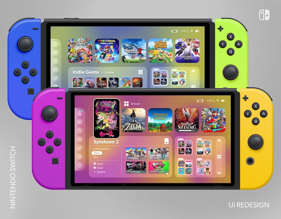 คอนเซ็ปต์ User Interface ใหม่สำหรับ Nintendo Switch มาพร้อมการปรับปรุงหน้าจอโฮม เพิ่มโฟลเดอร์ และ ปรับโฉม eShop ใหม่ บนกรอบหน้าต่างที่มีความโปร่งใส ขอบมุมโค้งมน รวมไปถึงไอคอนเกมก็อยู่ในรูปสี่เหลี่ยมจัตุรัสที่มีมุมโค้งมน ทำให้ภาพรวมสวยงาม สบายตา