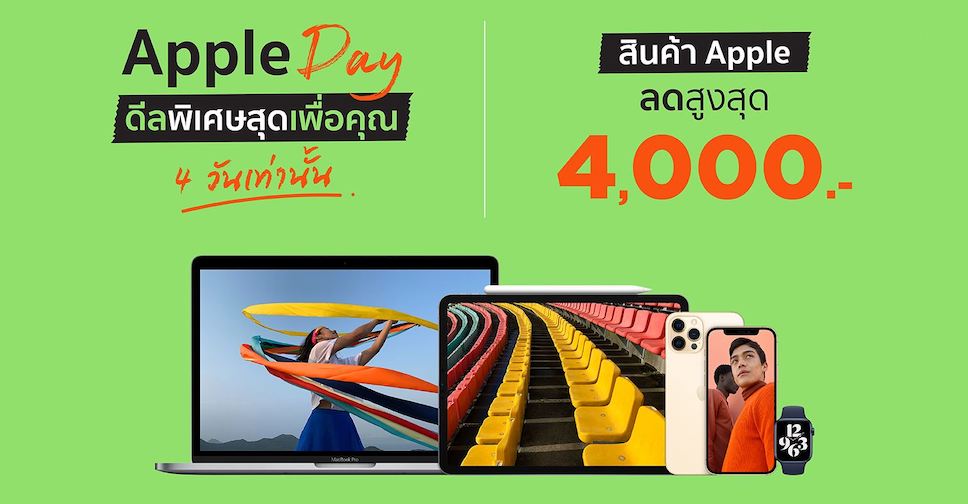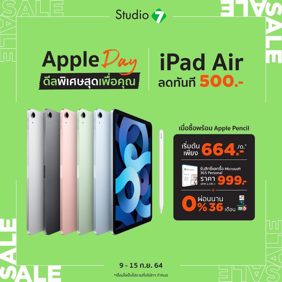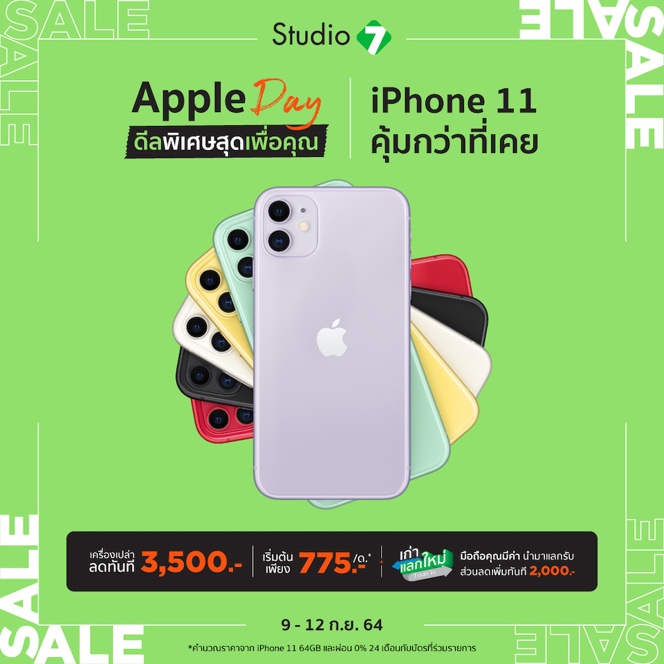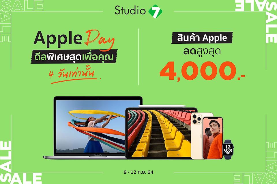 Studio 7 จัดโปรโมชั่น Apple Day นำเสนอสินค้า Apple ในราคาสุดคุ้ม ไม่ว่าจะเป็น iPhone, iPad, Mac, Apple Watch และอุปกรณ์เสริมต่างๆ ลดสูงสุด 4,000 บาท พร้อมให้ผ่อนสบาย 0% นานสูงสุด 36 เดือน พบกันได้ที่ Studio 7 สาขาใกล้บ้าน ระหว่างวันที่ 9 – 12 กันยายน 2564