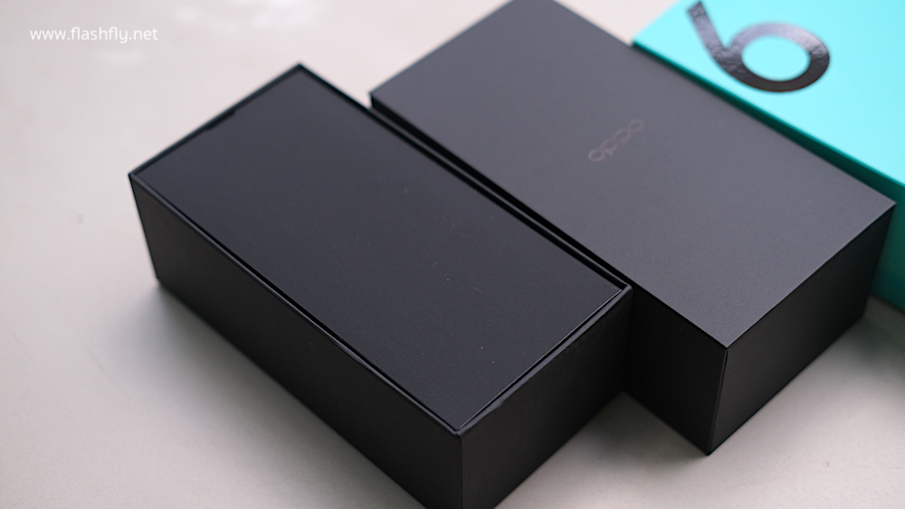 กล่องบรรจุภัณฑ์ของ OPPO Reno6 5G คล้ายกับกล่องของ OPPO Reno6 Pro 5G และ OPPO Reno6 Z 5G ที่ทีมงาน @Flashfly เคยรีวิวไปก่อนหน้านี้ โดยถูกเก็บไว้ในกล่องสีดำ ที่มีปลอกกล่องสีเขียวมิ้นท์หรือสีเขียวอมฟ้า ด้านหน้าพิมพ์เลข 6 ขนาดใหญ่ ซึ่งหมายถึงเป็นหนึ่งในสมาร์ทโฟน OPPO Reno6 Series 5G ส่วนล่างระบุชื่อรุ่น OPPO Reno6 5G ไว้อย่างชัดเจน