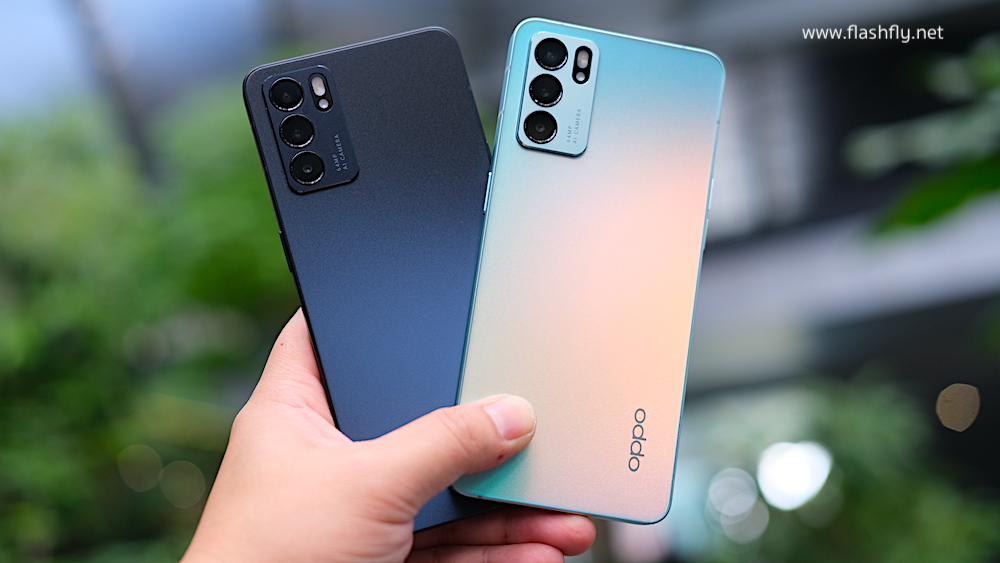 พื้นผิวด้านหลังของ OPPO Reno6 5G ยังใช้ดีไซน์ OPPO Reno Glow ที่เปล่งประกายระยิบระยับเช่นเดียวกับ OPPO Reno6 Z 5G และ OPPO Reno6 Pro 5G โดยมีให้เลือก 2 สี ได้แก่ Aurora ซึ่งเป็นโทนสีฟ้าอ่อน แต่มีเอฟเฟกต์ไล่ระดับสีที่สะท้อนออกมาในมุมมองที่แตกต่างกันไปตามแสงที่สาดส่องลงบนพื้นผิว และสามารถสะท้อนแสงไปบนผนังจนเกิดเป็นสีรุ้งอย่างส่วนงาม