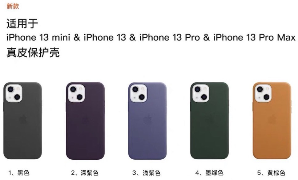 เคสหนังสำหรับ iPhone 13 จะมีให้เลือก 5 สี ได้แก่ สีดำ, สีม่วง, สีม่วงอ่อน, สีเขียวเข้ม และ สีน้ำตาล นอกจากนี้ ยังมีเคสโปร่งใสให้เลือกอีก 6 สี ตามรูปภาพด้านล่าง