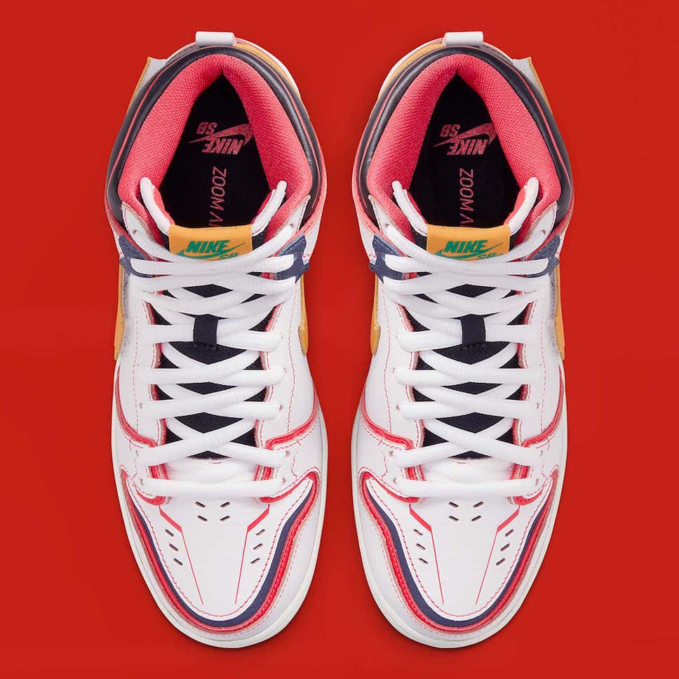 Nike SB Dunk High Gundam RX-0 Unicorn โดดเด่นที่ Swoosh ขนาดใหญ่ สามารถแกะออกแล้วติดใหม่ได้ มาพร้อมโลโก้ Unicorn โดยคู่สีขาวเรียกว่า Amarillo ส่วนอีกคู่ที่เข้มกว่าเรียกว่า Banshee