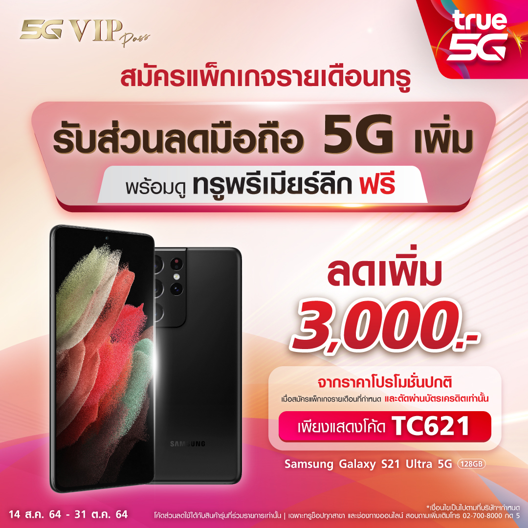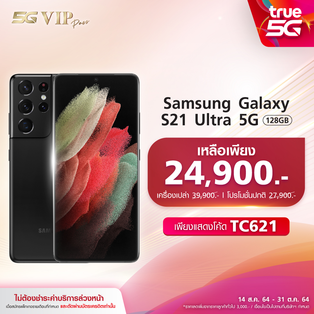 Samsung Galaxy S21 Ultra 5G (128GB) โปรโมชั่นปกติมีราคา 25,900 บาท แต่ถ้าสมัครแพ็กเกจรายเดือน 1,599 บาท กับ True 5G รับส่วนลดทันที 3,000 บาท เหลือ 22,900 บาท