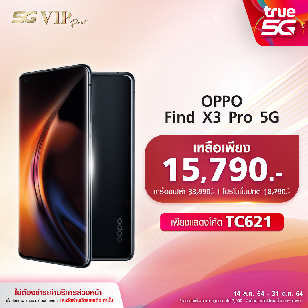 OPPO Find X3 Pro 5G โปรโมชั่นปกติมีราคา 18,790 บาท แต่ถ้าสมัครแพ็กเกจรายเดือน 1,399 บาท กับ True 5G รับส่วนลดทันที 3,000 บาท เหลือ 15,790 บาท