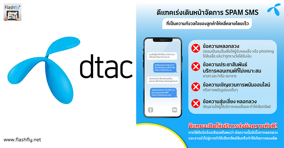 ดีแทคยกระดับมาตรการป้องกัน SMS Spam และเตรียมออกข้อมูลความรู้ซีรี่ส์ ที่จะทำให้รู้เท่าทันข้อความ SMS กวนใจ สร้างทักษะการรับมือแยกแยะภัยเสี่ยง ช่วยผู้ใช้บริการคลายความกังวลใจจากปัญหาเรื่องข้อความหลอกลวง ที่เข้ามาในโทรศัพท์เคลื่อนที่ ตอบรับความร่วมมือจากสำนักงานคณะกรรมการกิจการกระจายเสียง กิจการโทรทัศน์และกิจการโทรคมนาคมแห่งชาติ (กสทช.) ในฐานะหน่วยงานกำกับเรื่องสัญญาการให้บริการโทรคมนาคม ช่วยตรวจสอบจัดการ ไม่ให้มีข้อความ SMS และโทรศัพท์รบกวนในลักษณะนี้
