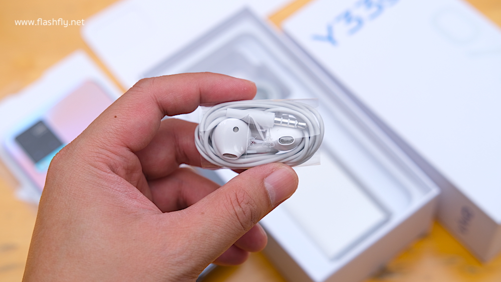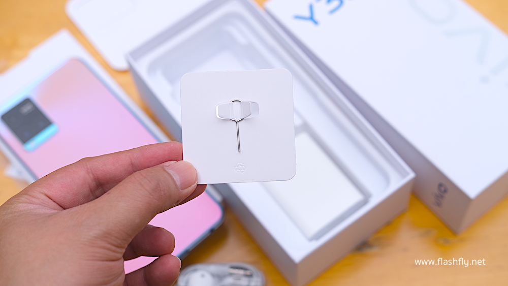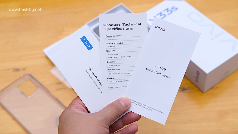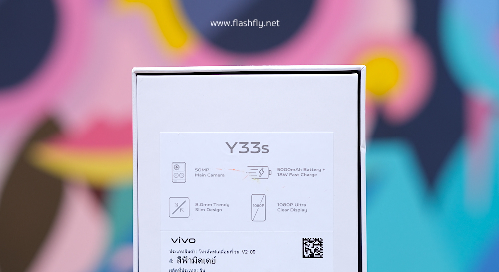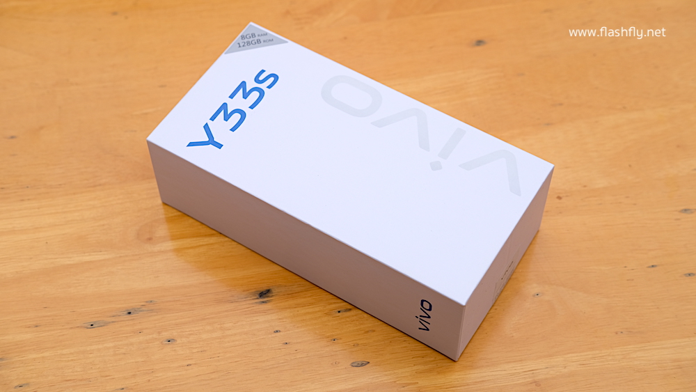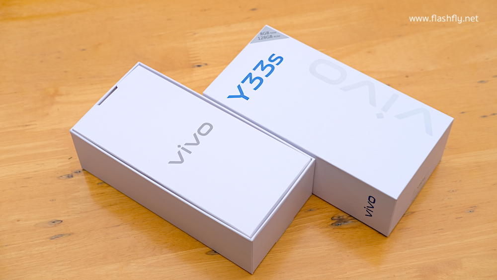 vivo Y33s ถูกเก็บไว้ในกล่องสีขาวล้วนสไตล์เดียวกับกล่อง vivo Y21 ที่ทีมงาน @flashfly เคยนำเสนอรีวิวไปแล้ว หน้ากล่องเห็นชื่อรุ่น Y33s ขนาดใหญ่ชัดเจน ติดโลโก้ vivo ในแนวตั้ง และที่มุมบนระบุความจำ RAM 8GB + ROM 128GB ด้านหลังกล่องบอกจุดเด่นไว้ 4 รายการ ได้แก่ กล้องหลัง 50 ล้านพิกเซล, แบตเตอรี่ความจุ 5,000mAh ชาร์จเร็ว 18W, ดีไซน์บางเพียง 8 มิลลิเมตร และ จอแสดงผล Full HD+ ขนาด 6.58 นิ้ว