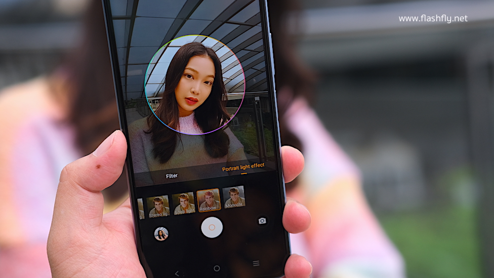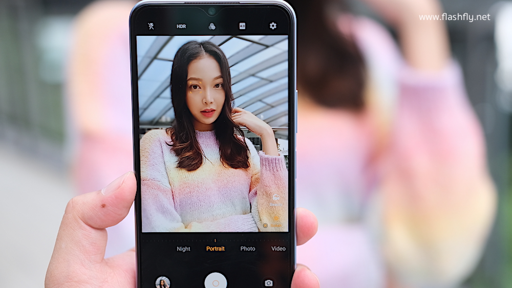 โหมดถ่ายภาพบุคคล หรือ Portrait สามารถปรับความงามใบหน้า พร้อมฟีเจอร์แนะนำการโพสท่า โดยมีตัวอย่างการโพสท่าให้ทำตามหลายแบบ และสามารถปรับระยะชัดลึกได้ โดยอาศัยการทำงานระหว่างกล้องหลัก 50MP กับกล้อง Bokeh ละลายฉลากหลังได้อย่างมืออาชีพ ขณะที่แถบเครื่องมือด้านบน ยังมีฟิลเตอร์และเอฟเฟกต์แสงสำหรับถ่ายภาพบุคคล เพื่อสร้างภาพ Portrait ให้สวยงามเหมือนมีอุปกรณ์จัดแสงจากสตูดิโอ
