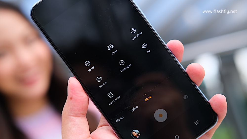 เมื่อเข้ามาในแอปกล้อง จะพบกับโหมดถ่ายภาพ Night, Portrait, Photo, Video และเมื่อเข้าไปที่ More จะพบกับโหมดถ่ายภาพที่เหลือ ไม่ว่าจะเป็น 50MP, Pano, Live Photo, Slow-Mo, Time-Lapse, Pro และ DOC
