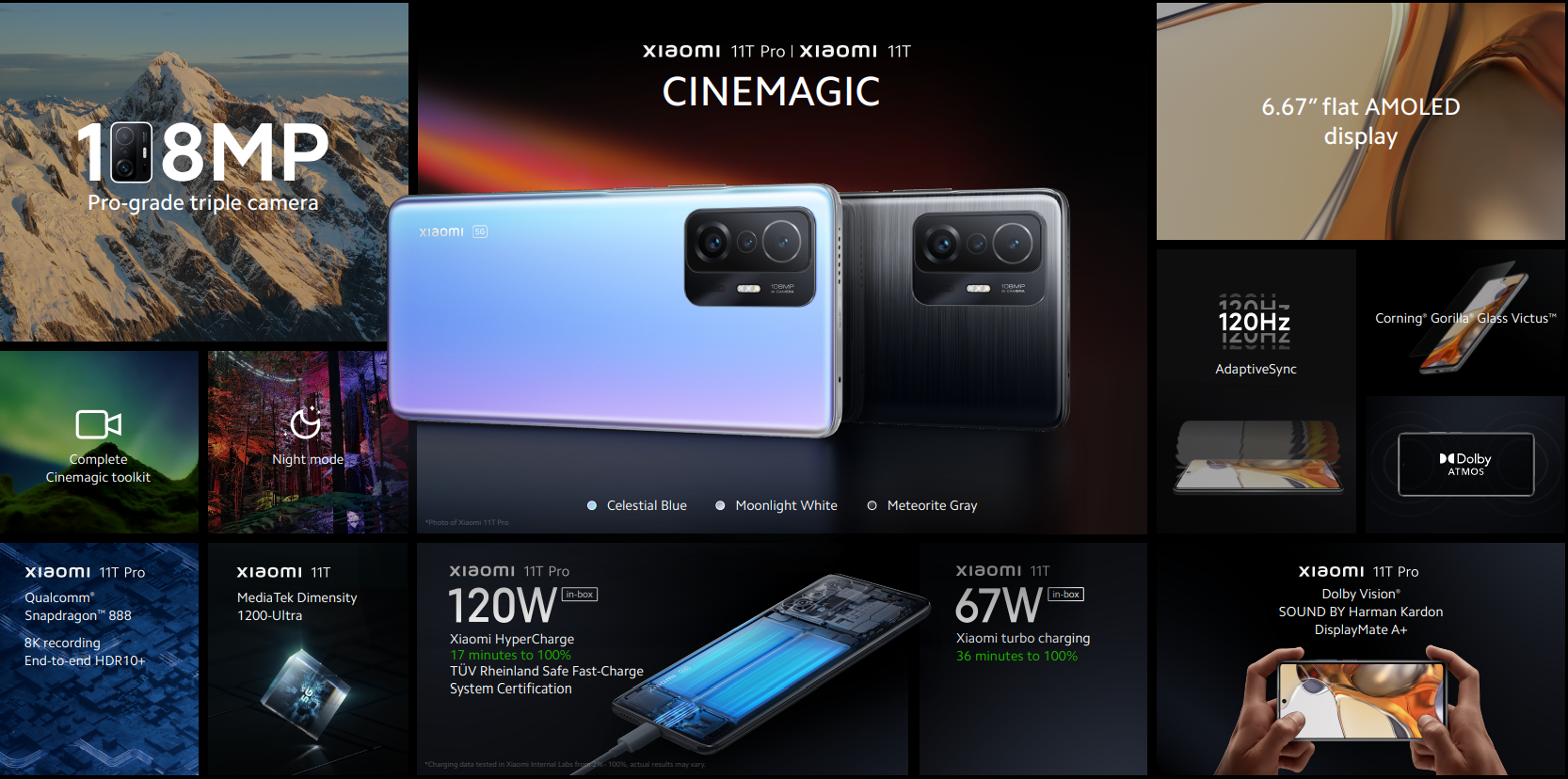 สัมผัสประสบการณ์ความบันเทิงที่เหนือกว่าในทุกมิติภายใต้คอนเซ็ปต์​“Cinemagic” กับสมาร์ทโฟนระดับแฟล็กชิปที่มาพร้อมกับประสิทธิภาพอันเยี่ยมยอด Xiaomi 11T Pro  มาพร้อมกับชิปเซ็ตระดับแฟล็กชิป Qualcomm® Snapdragon™ 888 กล้องระดับเทพถึงสามตัวเทียบชั้นกล้องโปร ประกอบด้วย กล้องหลักเลนส์ไวด์ความละเอียด 108MP, เลนส์อัลตราไวด์ 120 องศาความละเอียด 8MP, เลนส์ Telemacro ความละเอียด 5MP โหมด One-Click AI Cinema บันทึกภาพเคลื่อนไหวความละเอียดสูงถึง 8K และ HDR10+ และ Audio Zoom Xiaomi 11T Pro มีหน้าจอ AMOLED ความละเอียดระดับ FHD+ ขนาด 6.67 นิ้ว พร้อมทั้งรีเฟรชเรท 120Hz และผสานเทคโนโลยี TrueColor อีกด้วย นอกจากนี้ หน้าจอยังได้รับการรับรองด้วยคะแนน  A+ จาก DisplayMate และเคลือบด้วย Corning® Gorilla® Glass Victus™ เพื่อเสริมความทนทานอีกขั้น Xiaomi 11T Pro รองรับการแสดงผลภาพแบบ Dolby Vision® เพลิดเพลินกับคอนเทนต์ที่สีสันสดคมชัด สว่างไหวและเก็บได้ครบทุกรายละเอียด Xiaomi 11T Pro ยังรองรับระบบเสียง Dolby Atmos® ด้วยลำโพงคู่ให้เสียงทุ่มนุ่มนวลระดับ SOUND BY Harman Kardon ให้เสียงกระหึ่มไม่ว่าจะเพลิดเพลินคอนเทนต์รูปแบบใด  Xiaomi 11T Pro มาพร้อมกับแบตเตอรี่ขนาด 5000mAh ที่รองรับเทคโนโลยีการชาร์จใหม่ล่าสุดอย่าง 120W Xiaomi HyperCharge ที่บรรจุในสมาร์ทโฟนรุ่นนี้เป็นรุ่นแรกของโลก