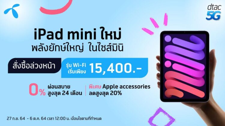 ดีแทคเตรียมวางจำหน่าย iPad (รุ่นที่ 9) รุ่น Wi-Fi และ iPad mini รุ่น Wi-Fi ที่มากความสามารถและราคาประหยัด ในดีไซน์ใหม่แบบหน้าจอทั้งหมด เริ่มจาก iPad mini มาพร้อมดีไซน์แบบหน้าจอทั้งหมด, ชิป A15 Bionic, 5G, คุณสมบัติ “จัดให้อยู่ตรงกลาง” และอีกมากมาย ในขณะที่ iPad มีชิป A13 Bionic ที่ออกแบบโดย Apple, คุณสมบัติ “จัดให้อยู่ตรงกลาง”, การแสดงผลแบบ True Tone และวันนี้มีพื้นที่จัดเก็บข้อมูลเริ่มต้นเพิ่มขึ้นสองเท่า ลูกค้าจะสามารถสั่งซื้อ iPad (รุ่นที่ 9) รุ่น Wi-Fi และ iPad mini รุ่น Wi-Fi ได้ตั้งแต่วันที่ 27 กันยายน 2564 ดูรายละเอียดเกี่ยวกับราคาและการวางจำหน่ายได้ที่ www.dtac.co.th
