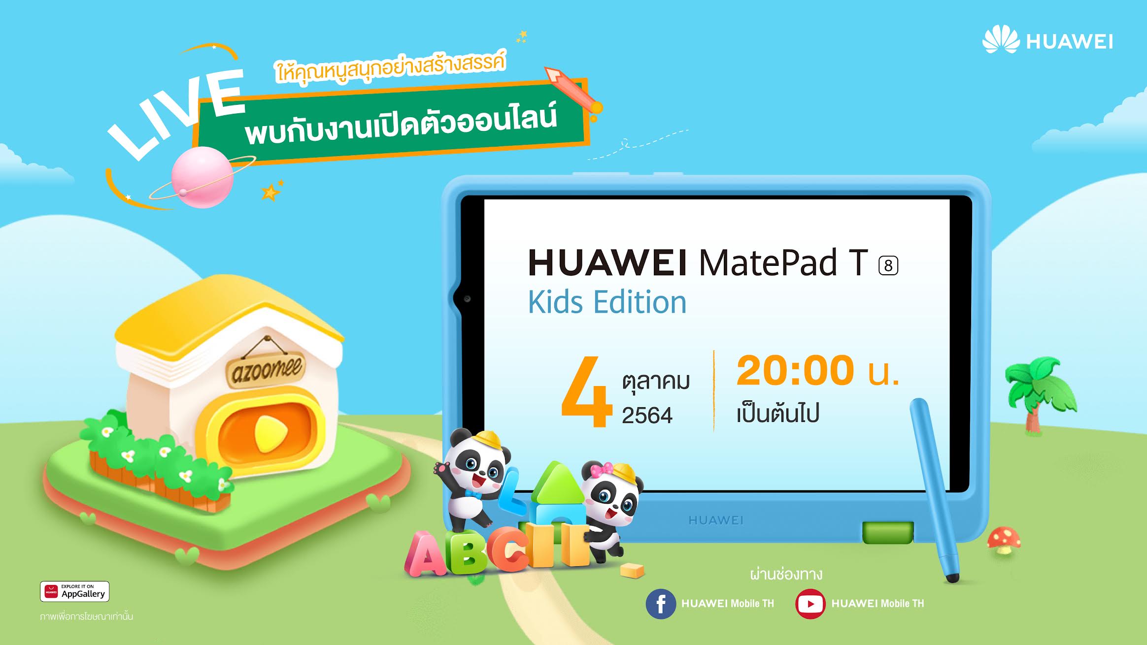 หัวเว่ย คอนซูมเมอร์ บิสสิเนส กรุ๊ป (ประเทศไทย) เตรียมตัวเปิดฉากเซอร์ไพรส์ครั้งใหญ่ในรอบปีจับกลุ่มตลาดเด็กและผู้ปกครองโดยเฉพาะ กับการเปิดตัวแท็บเล็ตสำหรับเด็ก HUAWEI MatePad T 8 Kids Edition ที่ตอบโจทย์การใช้งานของเด็กๆ ได้อย่างปลอดภัยสมวัยและเป็นประโยชน์ต่อการเรียนรู้และการเติบโตของเด็กแบบรอบด้าน เพราะมาพร้อมกับหลากหลายฟีเจอร์ที่เป็นประโยชน์และมัลติมีเดียแบบครบครันเพื่อสนับสนุนการเรียนแบบจัดเต็มและเพื่อการพักผ่อนที่แสนสนุกของเด็กๆ นอกจากราคาที่คุ้มค่า ยังพ่วงด้วยด้วยโปรโมชันพิเศษชุดใหญ่เอาใจผู้ปกครอง เตรียมตั้งตารอยกระดับการเรียนของน้องๆ หนูๆ ให้ล้ำสมัยและเพลิดเพลินกว่าที่เคยกับการเปิดตัวอย่างเป็นทางการของแท็บเล็ตสำหรับเด็ก HUAWEI MatePad T 8 Kids Edition ในประเทศไทยวันที่ 4 ตุลาคม 2564 เวลา 20.00 น.ที่ Facebook Huawei Mobile TH และ YouTube Huawei Mobile TH และสามารถติดตามรายละเอียดเพิ่มเติมเกี่ยวกับสินค้าและโปรโมชันสุดคุ้มที่ห้ามพลาดได้ที่นี่ และ Line Official Account HUAWEI Mobile Thailand และผ่านช่องทางจัดจำหน่ายต่างๆ ของหัวเว่ยทั้ง HUAWEI Experience Store, HUAWEI Store, HUAWEI Online Store หรือผ่านช่องทางอีคอมเมิร์ซ ได้แก่ ร้านค้าออนไลน์อย่างเป็นทางการของหัวเว่ยใน Shopee, Lazada และ JD Central