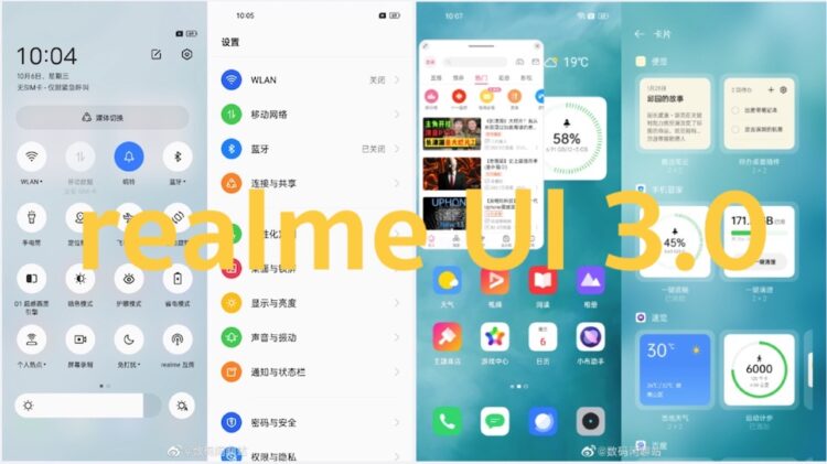 ภาพหน้าจอ realme UI 3.0 ที่ Digital Chat Station แชร์ออกมา แสดงให้เห็นดีไซน์หน้าจอโฮม ที่มีทั้ง Widget และไอคอนทางลัดของแอปต่างๆ, หน้าจอที่ให้ข้อมูลของอุปกรณ์, แผงการตั้งค่าด่วน หรือ Quick Settings, หน้าจอการตั้งค่า, ฟีเจอร์ย่อหน้าต่างแอป (คล้ายกับ Floating Window ของ ColorOS 12) และหน้าจอรวม Widget ทั้งหมด