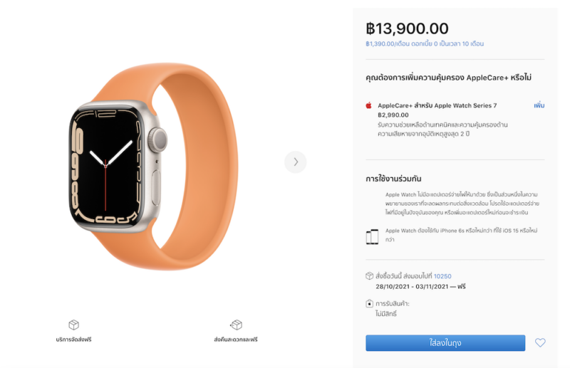 โดย Apple Watch Series 7 จะสั่งซื้อล่วงหน้าได้ทั้งรุ่น GPS และ GPS + Cellular ที่เป็นตัวเรือนอะลูมิเนียม ส่วนตัวเรือนสแตนเลสสตีล และไทเทเนียม จะเป็น GPS + CELLULAR ระยะการจัดส่งประมาณ 2-3 สัปดาห์ เริ่มจัดส่งวันที่ 28 ตุลาคม 2564 (ส่วนระยะเวลาในการจัดส่งสินค้าขึ้นอยู่กับขนาด ตัวเรือน สายที่เลือกและพื้นที่ในการจัดส่งสินค้า) โดยทั้งหมดมีราคาแตกต่างกันดังนี้