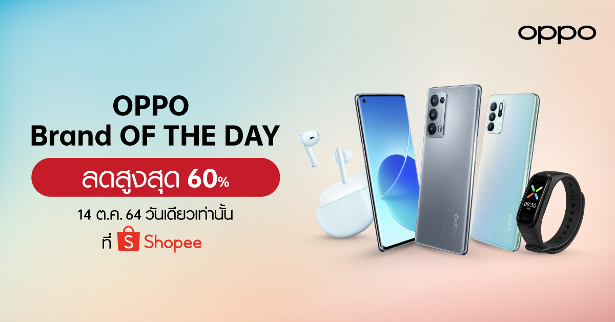 OPPO แบรนด์สมาร์ทโฟนชั้นนำในไทย เพิ่มความคึกคักกลางเดือนตุลาคม ส่งโปรฯ ลดแรงแบบไม่มีกั๊กผ่านแคมเปญ “OPPO Brand OF THE DAY” ด้วยส่วนลดสูงสุด 60% และคูปองสุดคุ้มสูงสุด 1,100 บาท สำหรับทั้งสมาร์ทโฟนและอุปกรณ์ IoT พร้อมรับของสมนาคุณมากมาย มูลค่ารวม 112,858 บาท เฉพาะ 14 ตุลาคมนี้ ที่ OPPO Official Store บน Shopee เท่านั้น