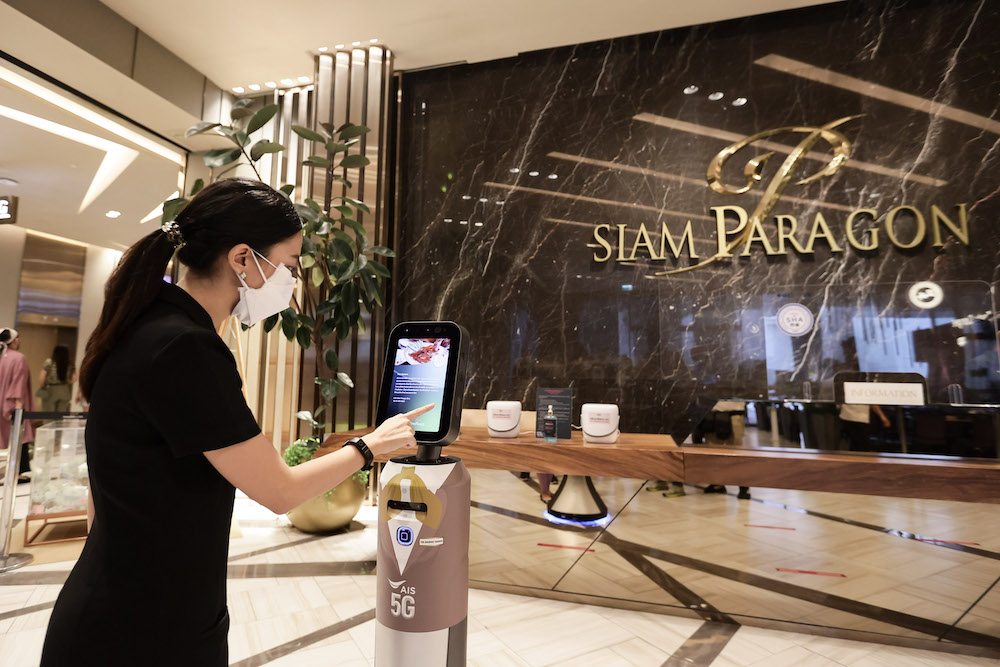 AIS จับมือ สยามพารากอน และ TKK ส่งทัพหุ่นยนต์อัจฉริยะ Robot Smart Retail ลงพื้นที่ปฏิบัติหน้าที่ดูแลคนไทย นำทางในศูนย์การค้าสยามพารากอน ประชาสัมพันธ์ข้อมูลแคมเปญต่างๆ ได้อย่างชาญฉลาด เพื่อลดการสัมผัส ป้องกันการแพร่ระบาดของเชื้อไวรัส COVID-19 ตอบรับวิถีใหม่ของโลก Retailogy สอดคล้องกับไลฟ์สไตล์ยุค New Normal โดยฟังก์ชั่นของหุ่นยนต์ Robot Smart Retail จะทำหน้าที่กล่าวทักทายและต้อนรับกับคนที่เข้ามาใช้บริการในศูนย์การค้า และนำทางไปยังร้านค้าได้อย่างแม่นยำ อีกทั้งยังสามารถประกาศข้อมูลแคมเปญต่างๆ ของร้านค้าที่ร่วมรายการได้อีกด้วย