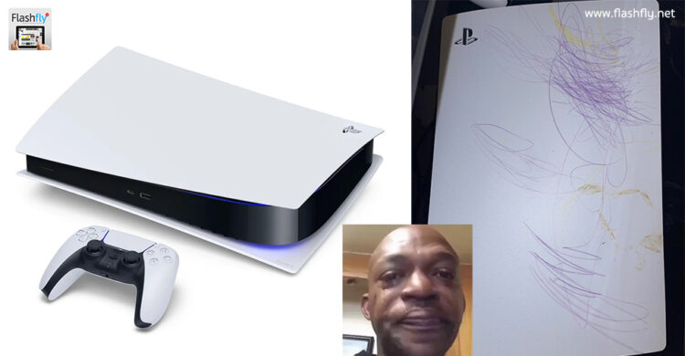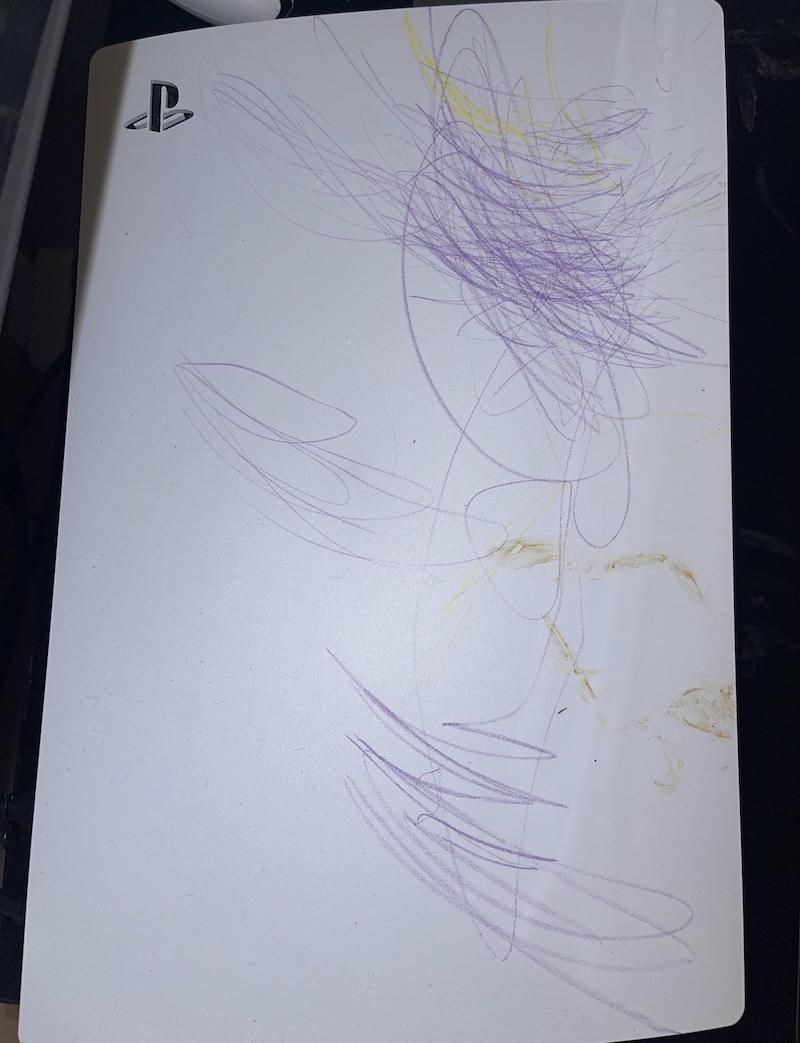 แผงด้านข้างของ PlayStation 5 เต็มไปด้วยพื้นที่สีขาวขนาดใหญ่ จนกลายเป็นผืนผ้าใบสำหรับลูกสาววัย 2 ของ LiveForTheDrip ที่บรรจงลงลายเส้นของสีม่วงและสีเหลืองจนเกือบทั่วทั้งแผ่น ที่น่าแปลกใจก็คือ หนูน้อยใช้มัสตาร์ดน้ำผึ้งระบายแทนสีด้วย