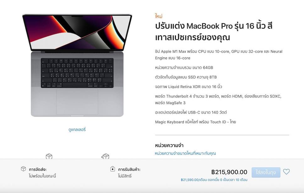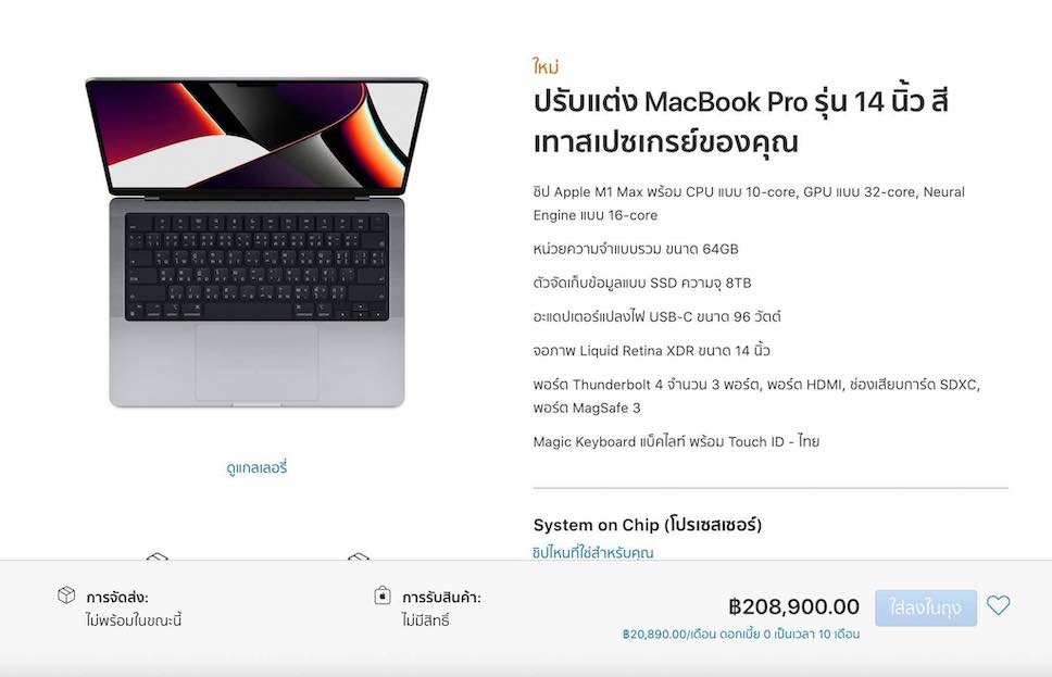Apple ประกาศราคา MacBook Pro รุ่นใหม่ ในประเทศไทยแล้ว ทั้งรุ่น 14 นิ้ว และ 16 นิ้ว โดยรุ่น 14 นิ้ว มีราคาเริ่มต้น 73,900 บาท และรุ่น 16 นิ้ว เริ่มต้นที่ 89,900 บาท อย่างไรก็ตามทั้ง 2 รุ่น สามารถเข้าไปอัพเกรดประสิทธิภาพให้แรงขึ้นได้ ซึ่งทำให้มีราคาพุ่งทะลุ 200,000 บาท