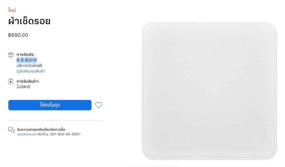 เว็บไซต์ MacRumors รายงานว่า ถ้าหากสั่งซื้อผ้าเช็ดรอย Polishing Cloth ของ Apple ในวันนี้ อาจจะได้รับการจัดส่งในช่วงวันที่ 18 – 24 พฤศจิกายน 2021 ซึ่งถือว่านานพอสมควร ขณะที่ Apple Store ของไทย แจ้งว่าใช้เวลาในการจัดส่ง 6 – 8 สัปดาห์ หรือต้องรอถึง 2 เดือน อย่างนานที่สุด