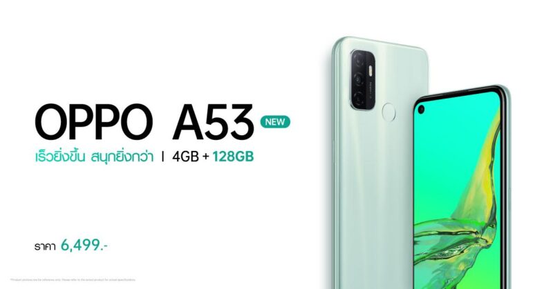 พบกับความเร็วแรงที่มากขึ้นและสนุกได้มากกว่าที่เคยกับ OPPO A53 NEW รุ่น RAM 4GB, ROM 128GB ใหม่ ได้ตั้งแต่วันที่ 22 ตุลาคม 2564 โดยมี 2 สีสันสดใสให้เลือก คือ สีเขียว Mint Cream และสีดำ Moonlight Black มาในราคาเพียง 6,499 บาท ที่ OPPO Brand Shop ทุกสาขา และตัวแทนจำหน่ายทั่วประเทศ