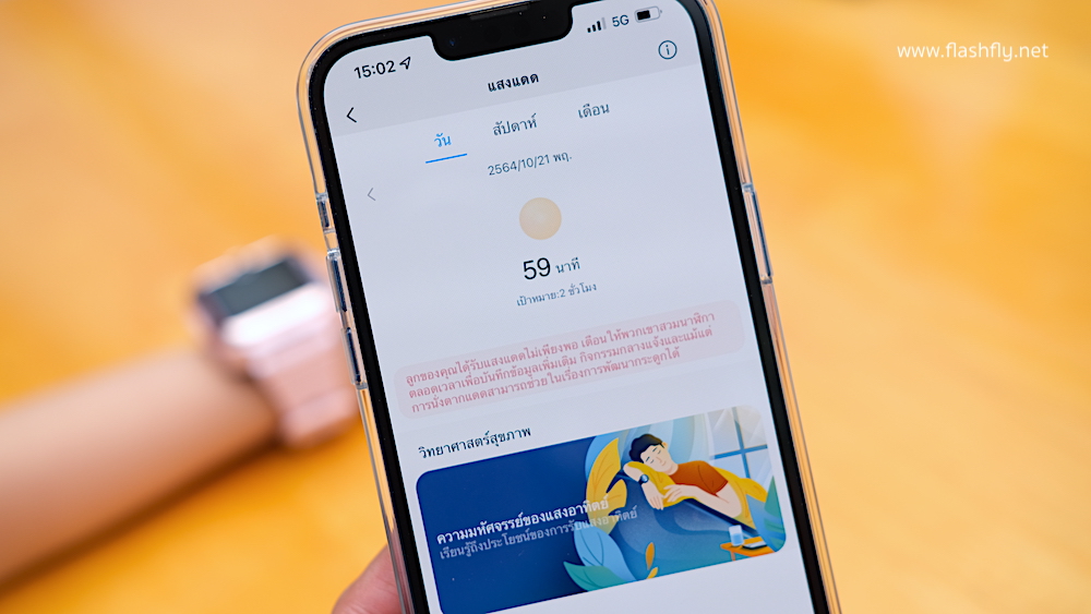 ใต้หน้าปัดระบุมาตรฐานป้องกันน้ำ 5ATM และถัดลงไปเป็นช่องลำโพงกับไมโครโฟนคู่