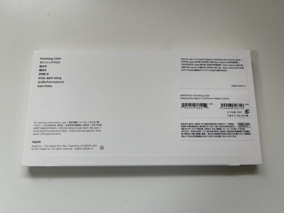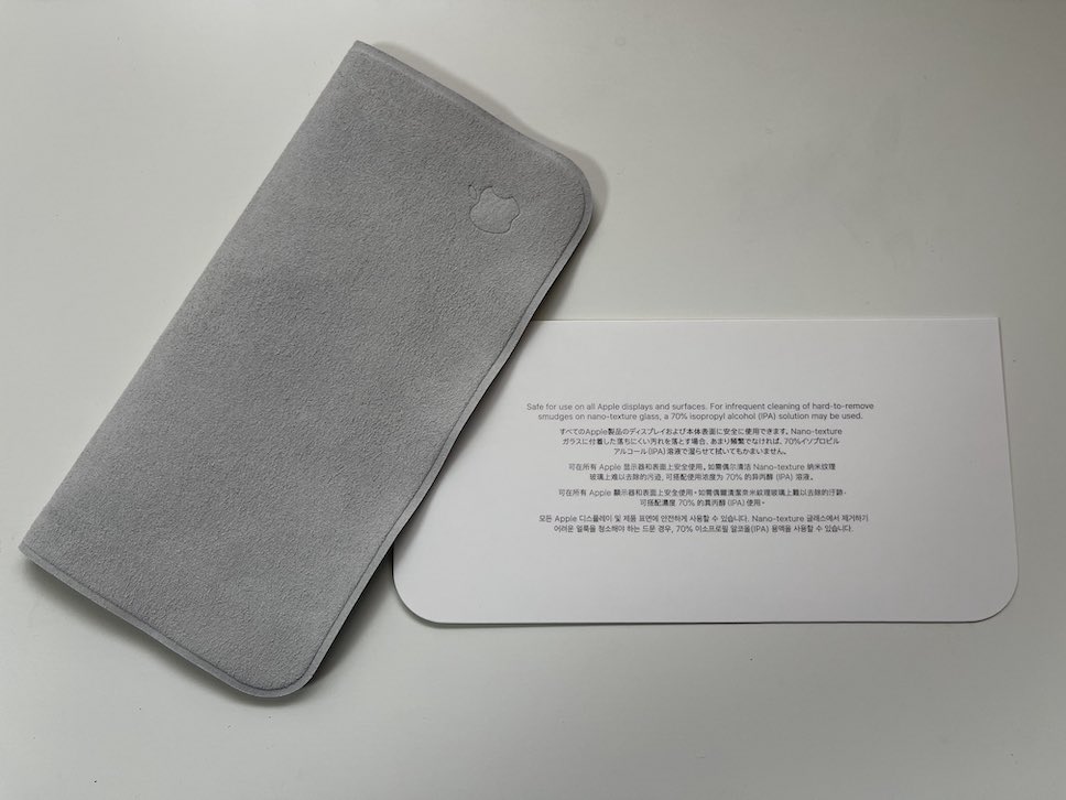 Apple ไม่ได้เปิดเผยว่าผ้าเช็ดรอย Polishing Cloth ทำมาจากวัสดุชนิดใด แต่ระบุว่า “ทำมาจากวัสดุที่อ่อนนุ่มและไม่ทำให้เกิดรอยขีดข่วน จึงใช้ทำความสะอาดจอภาพ Apple ทุกชนิด รวมถึงกระจก Nano-texture ได้อย่างปลอดภัยและมีประสิทธิภาพ”