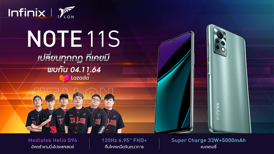 อินฟินิกซ์ (Infinix)เตรียมเปิดตัวสมาร์ตโฟนใหม่ล่าสุด Infinix NOTE 11S กับสโลแกน ”Game Changer – เปลี่ยนทุกกฎที่เคยมี” สมาร์ตโฟนสำหรับเล่นเกมที่ดีที่สุดในช่วงราคา 6,000 บาท ซึ่งในรุ่นก่อนหน้านี้อย่าง NOTE 10 Pro ได้รับกระแสตอบรับจากผู้ใช้งานอย่างล้นหลามและสร้างยอดขายได้เป็นอย่างดี และในรุ่น NOTE 11S ก็ยังจัดเต็มเหมือนเดิม โดยมาพร้อมความพิเศษที่ทาง Infinix ได้นำทีมแชมป์ RoV Pro-League 2021 Winter อย่าง DTAC Talon มาร่วมเป็นพรีเซนเตอร์และจัดกิจกรรมกับทางแบรนด์อินฟินิกซ์อีกด้วย สำหรับรุ่นนี้โดดเด่นเน้นการเล่นเกมโดยเฉพาะ ผสานกับการใช้งานที่ลื่นไหล เป็นสมาร์ตโฟนรุ่นแรกที่ใส่ซีพียู MediaTek Helio G96 เข้ามาทำตลาดในประเทศไทย ที่ให้แรมมาถึง 8GB พร้อมหน้าจอใหญ่ขนาด 6.95 นิ้ว FHD+ และรีเฟรชเรท 120Hz ให้แบตเตอรี่ความจุ 5000mAh พร้อมชาร์ตเร็ว 33W และเป็นรุ่นแรกที่มากับระบบปฏิบัติการ Android 11 ที่ครอบทับด้วย UI เวอร์ชั่นใหม่ล่าสุด XOS 10 จากทาง Infinix ซึ่งถือเป็นผลงานการออกแบบที่ยกระดับการใช้งานสมาร์ตโฟนและมอบประสบการณ์การเล่นเกมที่ดีที่สุดให้กับทุกคนได้อย่างแท้จริง