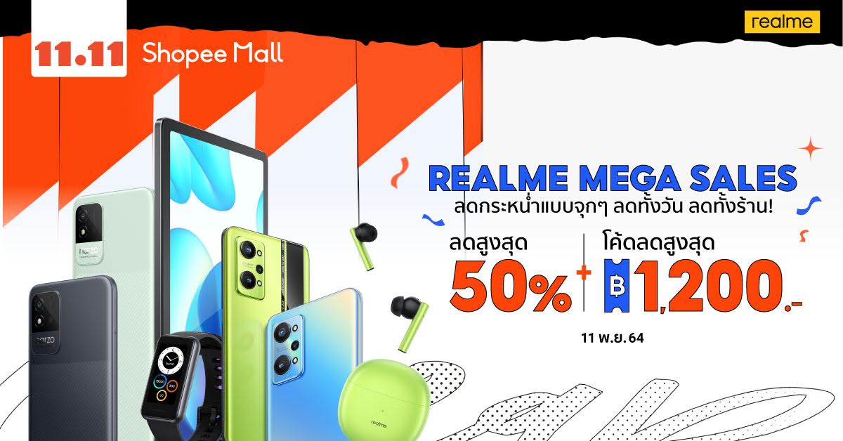 realme แบรนด์สมาร์ตโฟนเพื่อคนรุ่นใหม่ที่เติบโตเร็วที่สุดในโลก ยกขบวนสินค้าสมาร์ตโฟนและ AIoT ลดกระหน่ำแบบจัดเต็มในแคมเปญ 11.11 realme MEGA SALES  ลดสูงสุด 50% แถมโค้ดลดสูงสุด 1,200 บาท ในวันที่ 11 พฤศจิกายน 2564 เตรียมพบสินค้าสมาร์ตโฟนหลากหลายรุ่นและแกดเจ็ตสุดล้ำที่จะทำให้คุณได้สัมผัสกับ Smart Life ในราคาคุ้มค่าที่สุดแห่งปี!