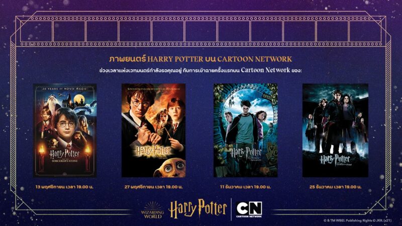 1 พฤศจิกายน 2564: เตรียมไม้กายสิทธิ์ของคุณและฝึกซ้อมร่ายคาถาให้พร้อม แล้วมาฉลองครบรอบ 20 ปีของภาพยนตร์ แฮร์รี่ พอตเตอร์กับศิลาอาถรรพ์ (Harry Potter and the Sorcerer’s Stone) ไปพร้อมกับ Cartoon Network และ HBO GO นับเป็นครั้งแรกที่ภาพยนตร์ 4 ภาคแรกจาก 8 ภาคของแฮร์รี่ พอตเตอร์ จะออกอากาศทาง Cartoon Network (3BB GIGA TV ช่อง 301, AIS Play ช่อง 402, True Vision ช่อง 453) โดยเริ่มเข้าฉายภาคแรกในวันเสาร์ที่ 13 พฤศจิกายน เวลา 19.00 น. และภาคต่อมาทุกสองสัปดาห์ รอติดตามเรื่องราวในโลกเวทมนตร์ของเด็กชายผู้รอดชีวิตและการต่อสู้กับเจ้าแห่งศาสตร์มืดอย่างโวลเดอมอร์แต่ละภาคกันได้ ในวันเวลาออกอากาศดังนี้