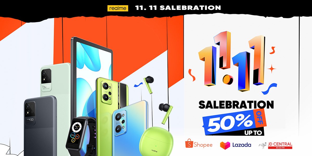 realme แบรนด์สมาร์ตโฟนเพื่อคนรุ่นใหม่ที่เติบโตเร็วที่สุดในโลก จัดโปรโมชั่นยิ่งใหญ่แห่งปี 11.11 realme MEGA SALES ขนสินค้ามาลดกระหน่ำเอาใจแฟนๆ realme ในวันที่ 11 พฤศจิกายน 2564 พบโปรโมชั่นราคาพิเศษ ลดกระหน่ำ ลดทั้งวัน ลดทั้งร้านกับส่วนลดสูงสุดกว่า 50% ที่ realme Official Store บนช่องทางออนไลน์เท่านั้น
