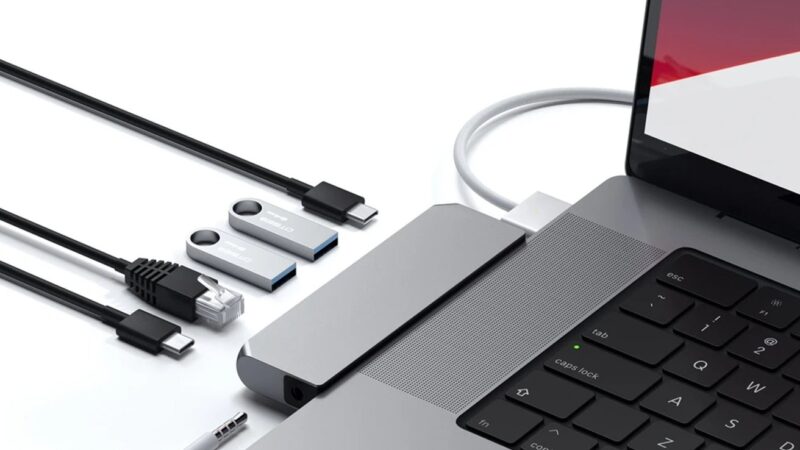 สำหรับ Satechi Pro Hub Mini นั้นจะเป็นฮับที่ติดเข้ากับด้านข้างตัวเครื่อง MacBook Pro รุ่นใหม่ โดยใช้งานพอร์ต USB-C และช่องต่อชุดหูฟังขนาด 3.5 มม. ทั้งหมด ซึ่งจะมาพร้อมกับพร้อม USB-C (USB 4) สำหรับชาร์จไฟ 96W หรือต่อหน้าจอความละเอียด 6K 60Hz และโอนถ่ายข้อมูล 40Gbps จำนวน 1 พอร์ต และยังมี USB-C สำหรับโอนถ่ายข้อมูล 5Gbps อีก 1 พอร์ต รวมถึงพอร์ต USB-A 3.0 อีก 2 พอร์ต น่าเสียดายที่ไม่รองรับการชาร์จไฟหรือใช้งานกับไดร์ฟ CD นอกจากนี้ก็ยังมีพอร์ต Gigabit Ethernet สำหรับเสียบสายแลนมาให้ใช้งาน และช่องต่อชุดหูฟัง 3.5 มม. เนื่องจากตัวฮับได้ปิดช่องต่อชุดหูฟังของตัวเครื่องไปหมดแล้ว