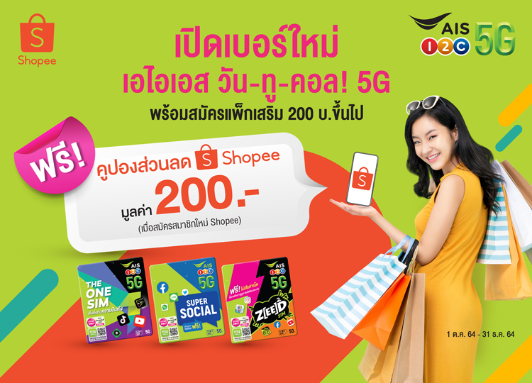 โดยครั้งนี้เป็นการทำงานร่วมกันของ AIS และ Shopee เพื่อส่งมอบสิทธิพิเศษที่ดีที่สุดสำหรับลูกค้าของทั้งสองฝ่าย ด้วยการมอบคูปองส่วนลด Shopee มูลค่า 200 บาท ให้กับลูกค้าที่มีการเปิดซิมใหม่ในระบบเติมเงิน โดยทำการสมัครแพ็กเสริม 200 บาทขึ้นไป และทำการสมัครสมาชิกใหม่ Shopee  ทั้งนี้ลูกค้าสามารถหาซื้อซิมได้ที่ AIS Shop, Telewiz และตัวแทนจำหน่ายตัวประเทศ รวมถึงช่องทางออนไลน์ผ่านทางร้านค้าออฟฟิเชียลสโตร์ AIS Official บน Shopee Mall หรือคลิก https://shopee.co.th/ais_official บน AIS Online Store, Become AIS หรือสั่งสื่อผ่านเว็บไซต์ one-2-call! ผ่าน Link : www.ais.th/one-2-call/ais-shopee/