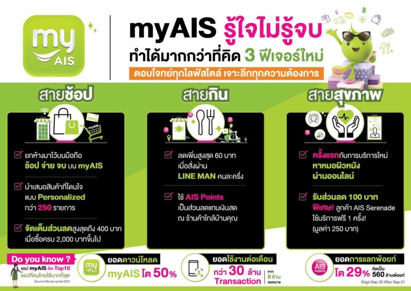 การดูแลลูกค้ากว่า 43.7 ล้านราย ทั้งด้านการใช้งาน และสิทธิพิเศษ ที่ตอบโจทย์ตรงใจอย่างแท้จริงถือเป็นเป้าหมายหลักของ AIS เสมอมา  โดยหัวใจสำคัญสูงสุดคือ ยกระดับช่องทางส่งมอบบริการดังกล่าวอย่างสอดคล้องกับรูปแบบการใช้ชีวิตที่วันนี้อยู่บน Online เป็นหลัก ซึ่ง AIS ได้ดำเนินการมาอย่างต่อเนื่อง ทำให้วันนี้  myAIS ก้าวสู่การเป็นไลฟ์สไตล์แอปไทยจากผู้ให้บริการมือถือเพียง 1 เดียว ที่ We Are Social รายงานสถิติ Thailand Digital Stat 2021 ได้จัดอันดับให้อยู่ใน Top10 ของแอปที่คนไทยใช้มากที่สุด (รวมแอป social ยอดนิยมต่างประเทศ) โดยล่าสุดชูแนวคิดmyAIS รู้ใจไม่รู้จบ ทำได้มากกว่าที่คิด เพิ่มฟีเจอร์ที่ตอบโจทย์ไลฟ์สไตล์หลัก สุขภาพ ช้อป กิน/ดื่ม ครบจบในแอปเดียว