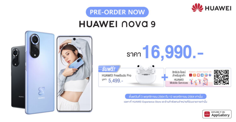 HUAWEI nova 9 วางจำหน่ายในราคา 16,990 บาท พร้อมโปรโมชันพรีออเดอร์ รับฟรี! หูฟังไร้สายระดับโปรฯ HUAWEI FreeBuds Pro มูลค่า 5,499 บาท เมื่อสั่งซื้อตั้งแต่วันที่ 3 พฤศจิกายน 2564 ถึง 12 พฤศจิกายน 2564 สามารถสั่งซื้อสินค้าทางเว็บไซต์ HUAWEI Store ร้านค้าอย่างเป็นทางการของหัวเว่ยบนแพลตฟอร์มออนไลน์ต่างๆ เช่น Shopee, Lazada และ JD Central