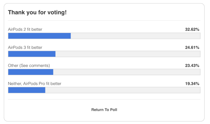 จากผลการสำรวจของ 9to5Mac เกี่ยวกับความพอดีในการสวมใส่หูฟังของ AirPods 3 ซึ่งก็ยังมีผู้ใช้งานโหวตให้กับ AirPods Pro ที่ใส่พอดีกับใบหูถึง 19.34% ถือว่าเป็น % ที่หลายคนยังชื่นชอบถึงแม้จะมีรุ่นใหม่ออกมาแล้วก็ตาม โดยAirPods 2 และ AirPods 3 นั้นจะมาในรูปแบบ Earbuds ส่วน AirPods Pro จะมาในรูปแบบ In-Ear