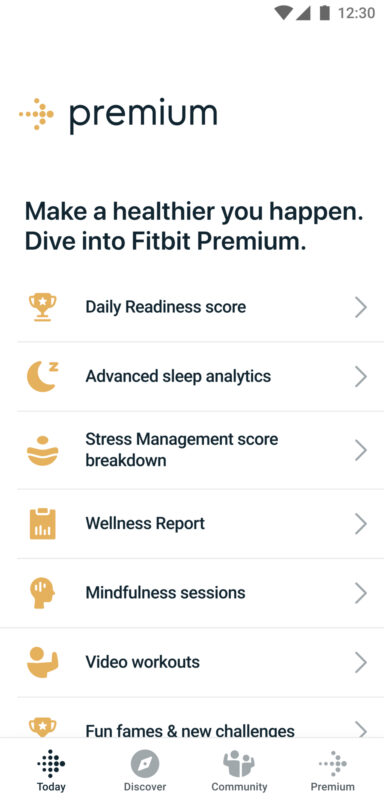 Premium: สมาชิก Premium จะได้รับสิทธิประโยชน์ต่าง ๆ มากมาย รวมถึงการเข้าถึงข้อมูลเชิงลึกบนฟีเจอร์อย่าง Health Metric Dashboard, Daily Readiness, Stress Management และ Sleep Scores ทั้งหมดนี้จะแสดงให้เห็นสุขภาพโดยรวมและความเป็นอยู่ที่ดีของคุณในแต่ละวัน การทำงานร่วมกันของฟีเจอร์เหล่านี้ จะช่วยให้คุณวางแผนการออกกำลังกายได้อย่างมีประสิทธิภาพ จัดการกับความเครียด มีพฤติกรรมการนอนและการกินอาหารที่ดียิ่งขึ้น นอกจากนี้ ฟิตบิท ยังมีการอัพเดทคลิปเสียงและวิดีโอออกกำลังกายใหม่ๆ อย่างต่อเนื่อง ตั้งแต่การออกกำลังกายรูปแบบบูทแคมป์ ไปจนถึงการฝึกการเคลื่อนไหว รวมถึงการอัพเดทคอนเทนต์จากแบรนด์ดังมากมายอย่างต่อเนื่อง อันเกี่ยวกับการดูแลสุขภาพร่างกาย อารมณ์ และโภชนาการ ที่มีอยู่กว่า 500 คอนเทนต์สำหรับสมาชิก Premium