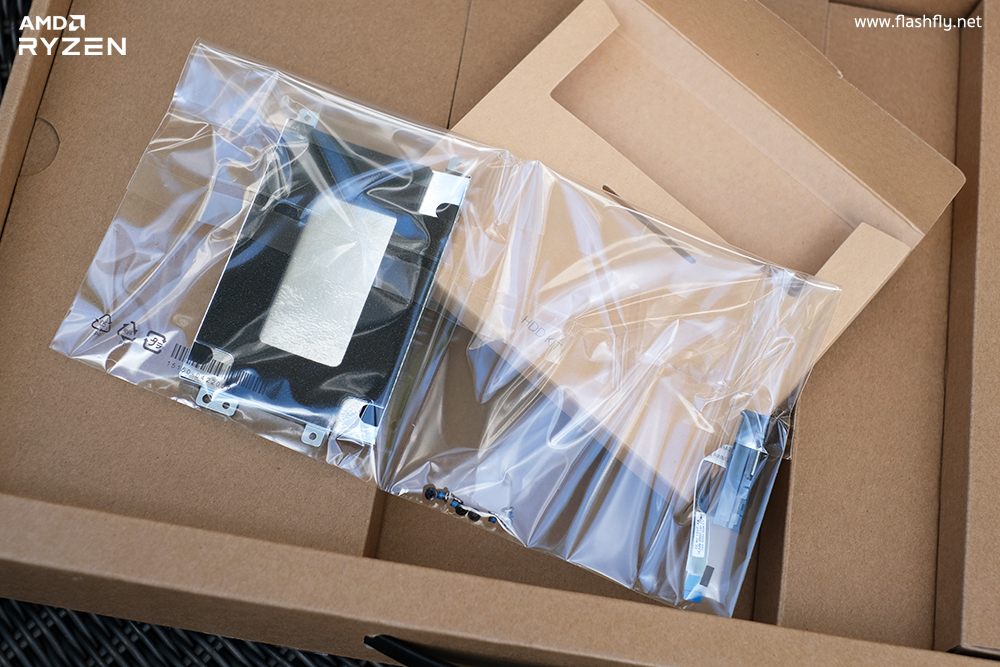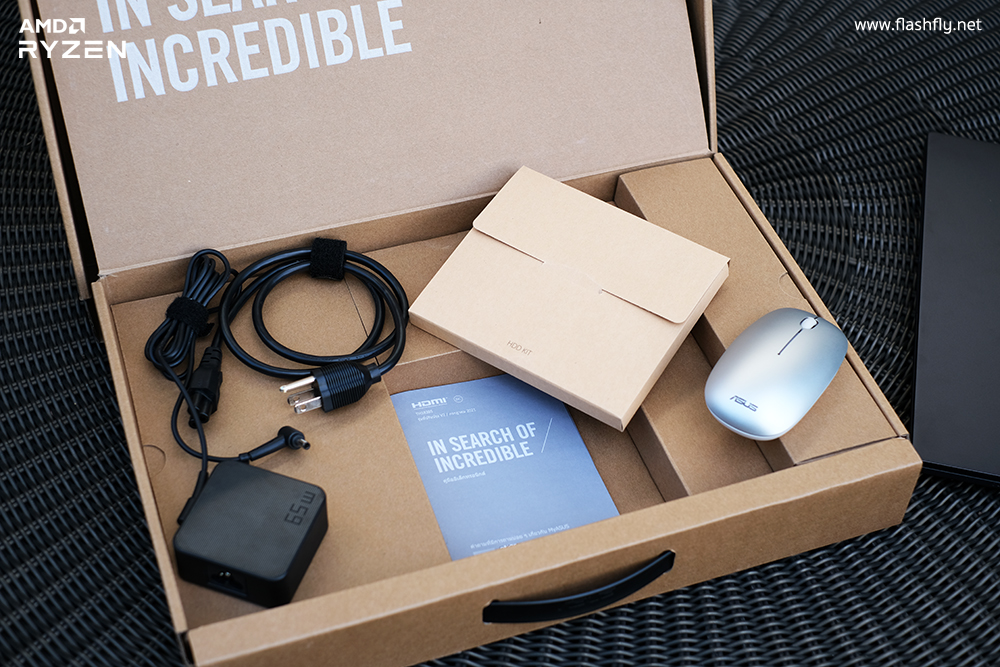 ASUS ExpertBook L1400 มาในกล่องสีน้ำตาล เมื่อเปิดออกมาก็จะพบกับตัวเครื่องวางอยู่ ตัวฝากล่องจะมีแกนยึดให้วางตั้งได้ และเมื่อเปิดออกมาก็จะมี AC Adapter 65W พร้อมสายไฟ, คู่มือการใช้งาน, ใบรับประกัน, HDD Kit สำหรับปรับแต่งฮาร์ดดิสก์ และแถมเมาส์ไร้สาย ASUS มาให้ใช้งานอีกด้วย
