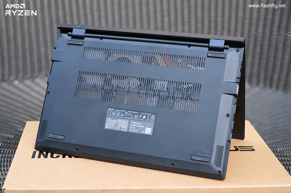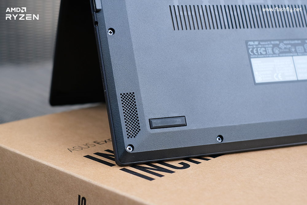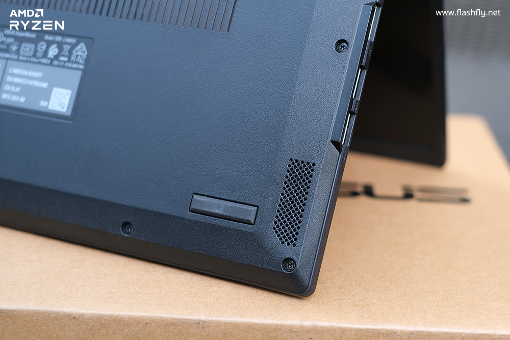 ด้านล่างตัวเครื่องมีดีไซน์เป็นตะแกรง 2 แถว เผยให้เห็นพัดลมและระบบระบายความร้อนด้านใน พร้อมกับเขียนคำว่า ExpertBook วางอยู่ ซึ่งจะมีจุดยางซิลิโคนกันลื่นวางไว้ตามมุมของตัวเครื่องทั้ง 4 จุดเพื่อวางใช้งานบนพื้นผิวต่างๆ และด้านข้างของตัวเครื่องก็จะมีการวางลำโพงสเตอริโอไว้ด้วย