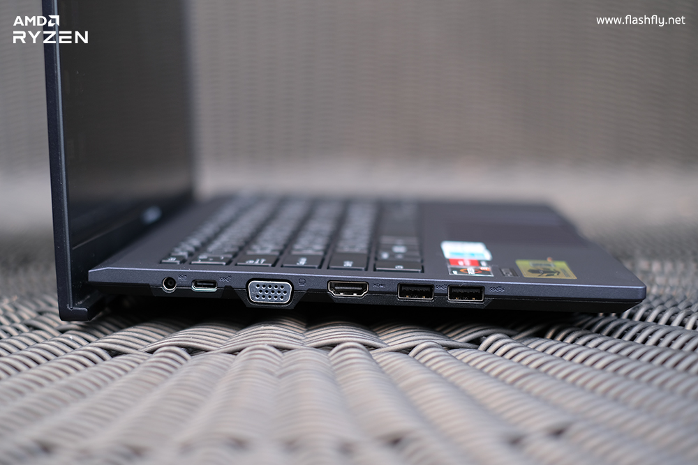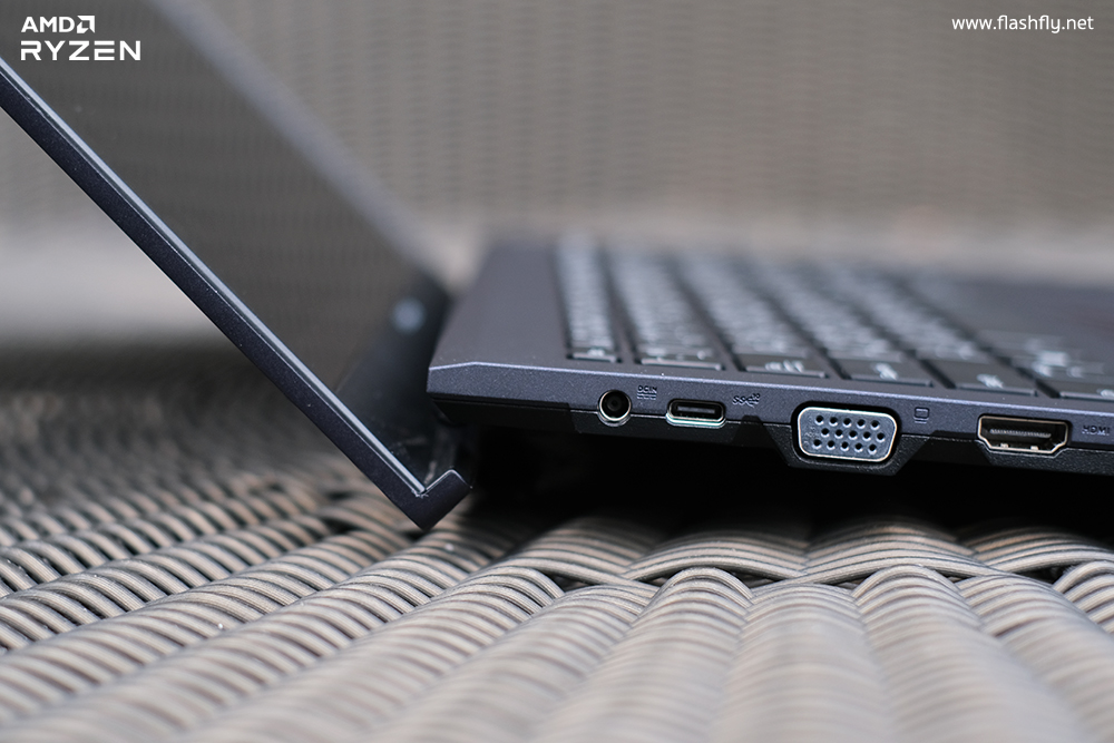 พอร์ตที่ให้มาใช้งานก็เรียกได้ว่าจัดเต็ม โดยด้านซ้ายของตัวเครื่องมีช่องเสียบปลั๊กไฟชาร์จแบตเตอรี่, USB-C รองรับการถ่ายโอนถ่ายข้อมูล, พอร์ต VGA, พอร์ต HDMI, USB-A จำนวน 2 พอร์ต