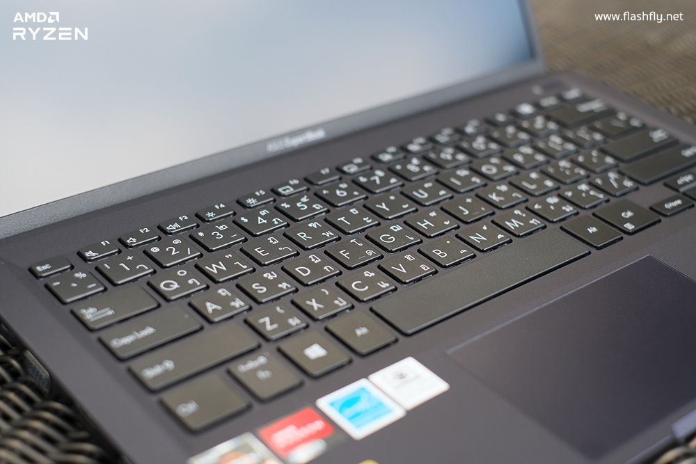 คีย์บอร์ดของ ASUS ExpertBook L1400 เป็นปุ่มขนาดมาตรฐาน ระยะกด 1.5 มิลลิเมตร มาพร้อมแถวปุ่มฟังก์ชัน F1-F12 ที่แยกออกมา โดยจะใช้ร่วมกับปุ่มคำสั่งคีย์ลัดต่างๆ อาทิ เพิ่มลดแสงหน้าจอ, เพิ่มลดเสียง ซึ่งสามารถกดเพื่อใช้งานได้เลย แต่ถ้าจะใช้ปุ่มฟังก์ชันจะต้องกดปุ่ม Fn ด้วย และแถวปุ่มฟังก์ชันนี้จะมีขนาดเล็กลงเพื่อประหยัดพื้นที่สำหรับใส่ปุ่มอื่นๆ เพิ่มเติม อาทิ Prt Sc, Delete น่าเสียดายที่ไม่มีไฟ LED Backlit มาให้ ดังนั้นเวลาใช้งานในที่แสงน้อยอาจจะมองหาปุ่มยากขึ้นสักนิดนึง