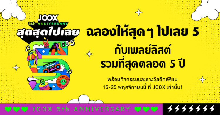 JOOX โชว์ความสำเร็จครบรอบ 5 ปี ครองการเป็น ‘แอปคอมมูนิตี้ของคนรักเสียงเพลง และความบันเทิงอันดับ 1 ของไทย’ ฉลองจัดเต็มภายใต้คอนเซปต์ ‘#JOOXสุดๆไปเลย5’ ส่งตรงขบวน ความสนุก และความบันเทิงเต็มอิ่มตลอดเดือนพฤศจิกายน ไม่ว่าจะเป็นการจับมือกับพาร์ทเนอร์ชั้นนำ จัดไลฟ์คอนเสิร์ตสุดปัง ได้แก่ High Cloud Entertainment Presents ‘LIGHT UP IN THE STORM’ Powered by JOOX และ Huawei Nova 9 Music Festival รวมถึงจัดไลฟ์คอนเสิร์ตแห่งปีกับงาน JOOX Thailand Top 100 ปีที่ 5 นอกจากนี้ยังมีการครีเอท 25 เพลย์ลิสต์สุดพิเศษ และจัดกิจกรรมชิงรางวัลสุดเซอร์ไพรส์เป็นของขวัญให้แก่ผู้ใช้งาน JOOX พร้อมเดินหน้าก้าวสู่ปีที่ 6 มุ่งพัฒนาศักยภาพแพลตฟอร์ม และคอนเทนต์อย่างต่อเนื่อง เพื่อยืนหนึ่งในฐานะผู้นำตลาดมิวสิคสตรีมมิง และเข้าไปอยู่ในทุกไลฟ์สไตล์ของคนไทย และเอเชีย