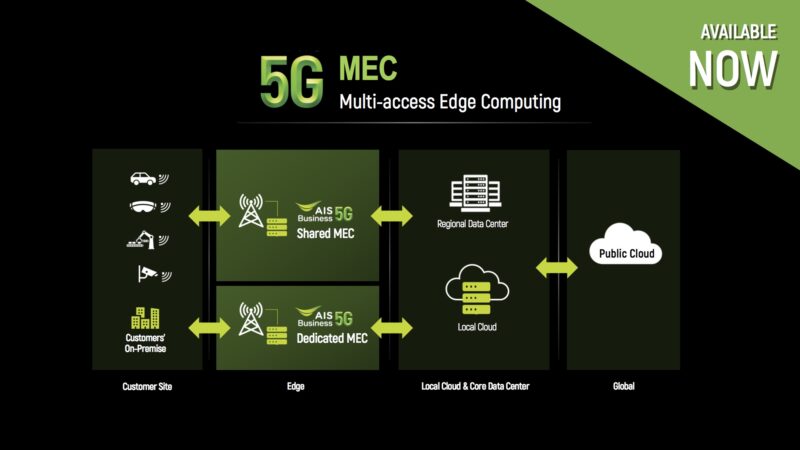 · MEC (Multi-access Edge Computing) เป็นบริการที่นำเอาศักยภาพในการประมวลผล และการจัดการกับข้อมูลมาอยู่ใกล้กับผู้ใช้งานหรืออุปกรณ์มากขึ้น เพื่อช่วยลดปริมาณการรับส่งข้อมูลระหว่างอุปกรณ์ และ Cloud อีกทั้งยังช่วยลดความหน่วง (latency) เพื่อตอบสนองต่อเหตุการณ์ต่างๆ ได้อย่างทันท่วงที โดยทาง AIS พร้อมให้บริการร่วมกับพาร์ทเนอร์ระดับโลกที่มาร่วมกันมากมายทั้ง Huawei, HPE, Microsoft และ ZTE ซึ่งให้บริการได้แล้วใน 2 โมเดล คือ Shared MEC และ Dedicated MEC ที่จะช่วยเพิ่มความเป็นส่วนตัวของข้อมูลหรือ Data Privacy