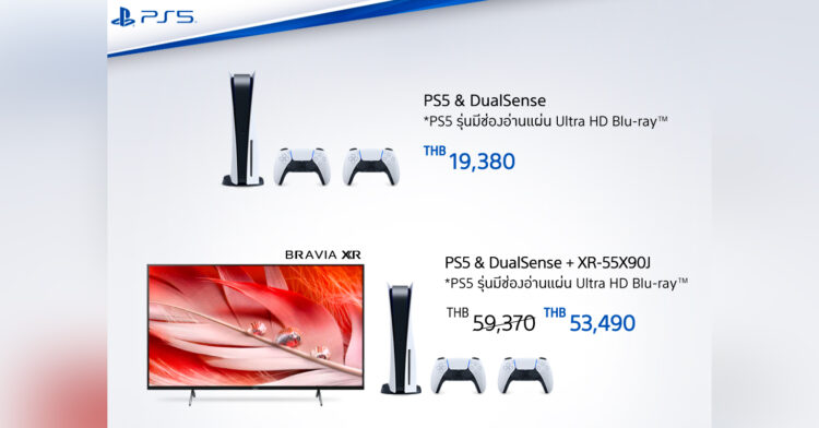 - PlayStation5 รุ่นมีช่องอ่านแผ่น Ultra HD Blu-ray™ คู่กับคอนโทรลเลอร์ไร้สาย DualSense ราคาแพ็กเกจ 19,380 บาท