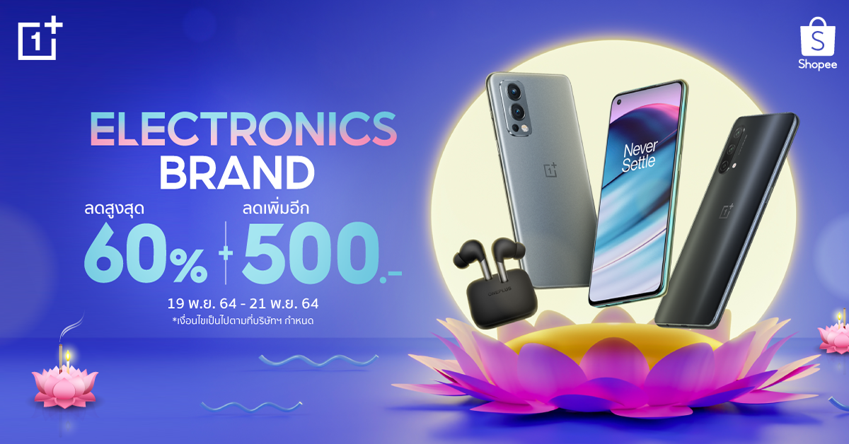 OnePlus Electronics Brand & Loy Krathong เตรียมช้อปสนุกวันลอยกระทง OnePlus ยกทัพสมาร์ทโฟน หูฟังและอุปกรณ์เสริม มาลดราคากระหน่ำ ลดสูงสุด 60% พร้อมคูปองลดเพิ่มอีก 500 บาท เฉพาะวันที่ 19 – 21 พฤศจิกายน 2564 นี้ ที่ร้าน OnePlus official store