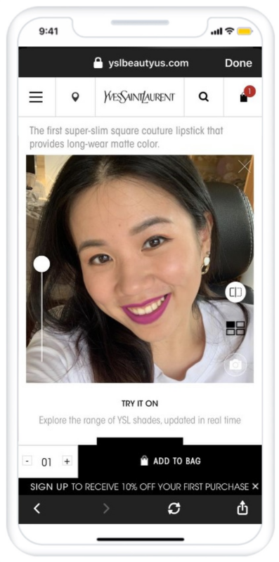แบรนด์เครื่องสำอาง ลอรีอัล ปารีส ประเทศไทย ใช้เทคโนโลยี Augmented Reality เพื่อสร้างสรรค์ฟิลเตอร์ที่ทำให้ผู้บริโภคสามารถทดลอง “ทา” ผลิตภัณฑ์ลิปสติกใหม่ที่มาพร้อมเฉดสีที่หลากหลาย และเมื่อใช้ควบคู่กับโฆษณา Facebook ที่กระตุ้นให้ผู้บริโภคใช้งานฟิลเตอร์ Augmented Reality ดังกล่าว ทำให้บริษัทประสบความสำเร็จในการเพิ่มคะแนนเจตนาในการซื้อสินค้าที่ 3.4 คะแนน เพิ่มคะแนนความตระหนักรู้ในฐานะแบรนด์ในใจที่ 1.5 คะแนน และเพิ่มคะแนนการจดจำโฆษณาที่ 13.4 คะแนน เน้นให้เห็นถึงความสำคัญของศักยภาพของเทคโนโลยีในการเชื่อมต่อลูกค้าเข้ากับผลิตภัณฑ์ ผ่านประสบการณ์แห่งความเสมือนจริงและการมีตัวตนอยู่จริงในปัจจุบัน
