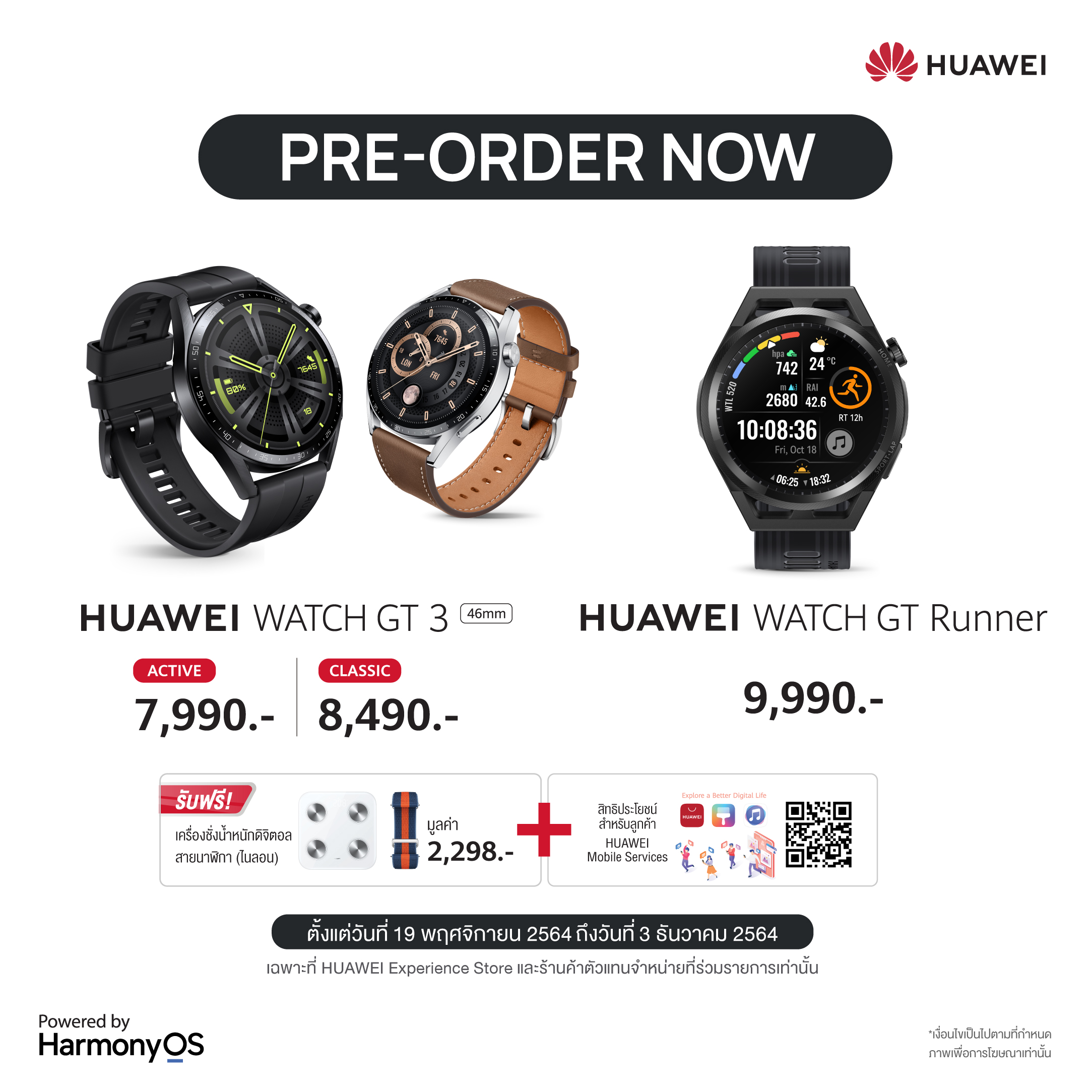 HUAWEI WATCH GT 3 Series ขนาด 46 มม. Classic Edition วางจำหน่ายในราคา 8,490 บาท และ ขนาด 46 มม. Active Edition วางจำหน่ายในราคา 7,990 บาท และ HUAWEI WATCH GT Runner ขนาด 46 มม. ในราคา 9,990 บาท สั่งจองล่วงหน้าได้ที่หน้าร้าน HUAWEI Experience Store และร้านค้าตัวแทนจำหน่ายที่ร่วมรายการ และช่องทางออนไลน์ทั้งเว็บไซต์ HUAWEI Store และร้านค้าออนไลน์อย่างเป็นทางการของหัวเว่ยใน Shopee, Lazada และ JD Central รับฟรีเครื่องชั่งน้ำหนักดิจิทัลและสายนาฬิกาไนลอน มูลค่ารวม 2,298 บาท