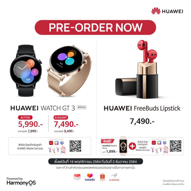 HUAWEI WATCH GT 3 Series ขนาด 42 มม. Elegant Edition สั่งจองได้ในราคาพิเศษ 7,490 บาท จากราคาปกติ 9,490 บาท และ ขนาด 42 มม. Active Edition ราคาพิเศษ 5,990 บาท จากราคาปกติ 7,990 บาท พร้อมดีลพิเศษเมื่อซื้อคู่กับ HUAWEI FreeBuds Lipstick จะมาในราคาพิเศษ 5,490 บาท จากราคาปกติ 7,490 บาท