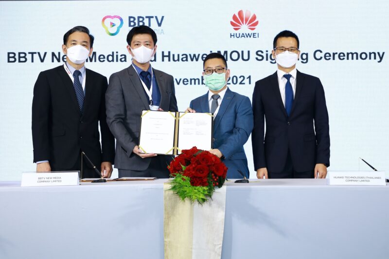 โรเบน หวัง (ที่ 3 จากซ้าย) ประธานกลุ่มธุรกิจ HUAWEI CLOUD และ AI บริษัท หัวเว่ย เทคโนโลยี่ (ประเทศไทย) จำกัด ร่วมลงนามความร่วมมือในการนำเทคโนโลยีมาช่วยพัฒนาการดำเนินงานของธุรกิจสื่อ โดยมี คุณพัฒนพงค์ หนูพันธ์ (ซ้ายสุด) รักษาการกรรมการผู้จัดการและรองกรรมการผู้จัดการ (ซ้ายสุด) บริษัท บีบีทีวี นิว มีเดีย จำกัด และคุณอาเบล เติ้ง (ขวาสุด) ประธานกรรมการบริหาร บริษัท หัวเว่ย เทคโนโลยี่ (ประเทศไทย) จำกัด ร่วมเป็นสักขีพยาน